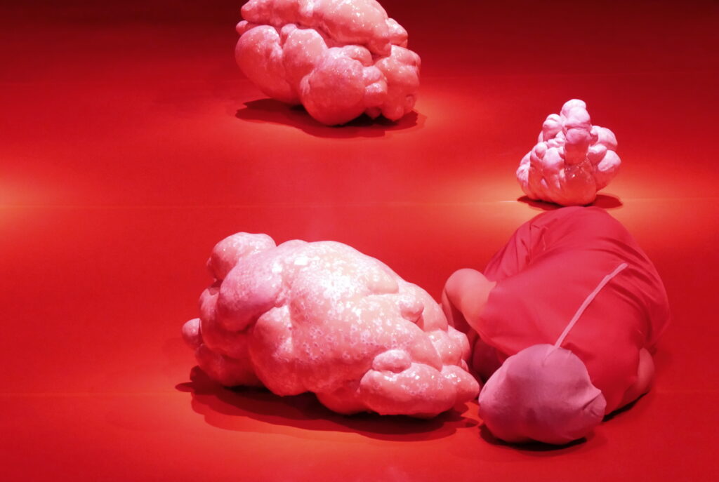 Scenrummet flödar i färgerna rosa, blått och spygrönt. Det kunde vara våra inälvors färg eller flickrummets rosa drömland och oskuldens sfär. Fabrice Bony´s musik är skapad spelandes på stenar; en slags uråldrig ton som är ihop mixade med SU-ENs råa andning- och röstkompositioner.